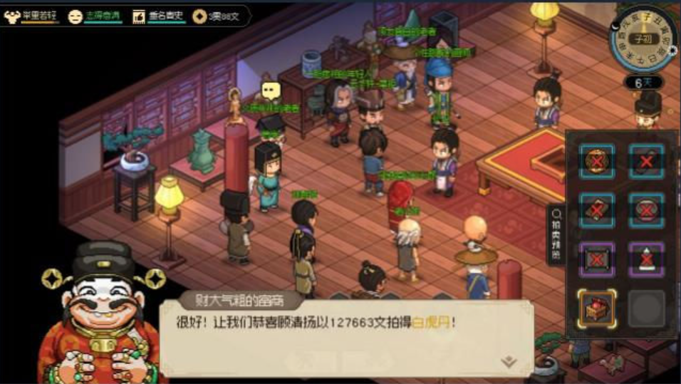 玩家进入珠光宝气楼后,会看到一张桌子,桌子上有一个铜钟,玩家可以选择敲响铜钟,开始拍卖会。拍卖会开始后,珠光宝气楼的老板石万三会介绍本次拍卖会的规则,以及本次拍卖会的拍品数量和种类,拍品分为普通拍品和神秘拍品,普通拍品是固定的,神秘拍品是随机的,每次拍卖会的神秘拍品数量和种类都不同。拍品有不同的等级,分为丁、丙、乙、甲四个等级,等级越高,拍品的价值和稀有度越高,拍卖会的拍品的价格由珠光宝气楼的老板石万三根据拍品的等级、类型、来源、稀有度等因素决定,价格会随着拍卖会的进行而上涨随机性较高。