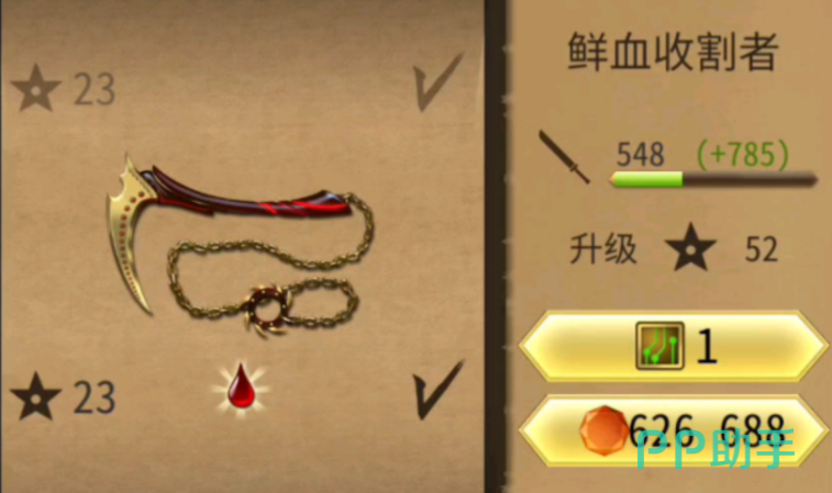 鲜血收割者是暗影格斗2中的另一把高伤害武器,它的外形是一把两只手操纵的弯刀,可以对敌人造成持续的流血效果,每秒损耗五滴血量,让敌人的生命值不断下降。鲜血收割者的攻击方式也很独特,它可以在空中旋转,对敌人进行多方位的攻击,也可以在地面上进行快速的刺击,让敌人难以防御。鲜血收割者的缺点是它的出招速度和泰坦刀差不多,也不是很快所以在战斗中需要保持一定的距离,不要敌人占据优势。鲜血收割者也是一把需要花费125个钻石才能购买的武器。但是在前期的生命值总额debuff效果并不是很好,所以小编不建议大家在前期省钱获取,鲜血收割者最好在后期再拿。