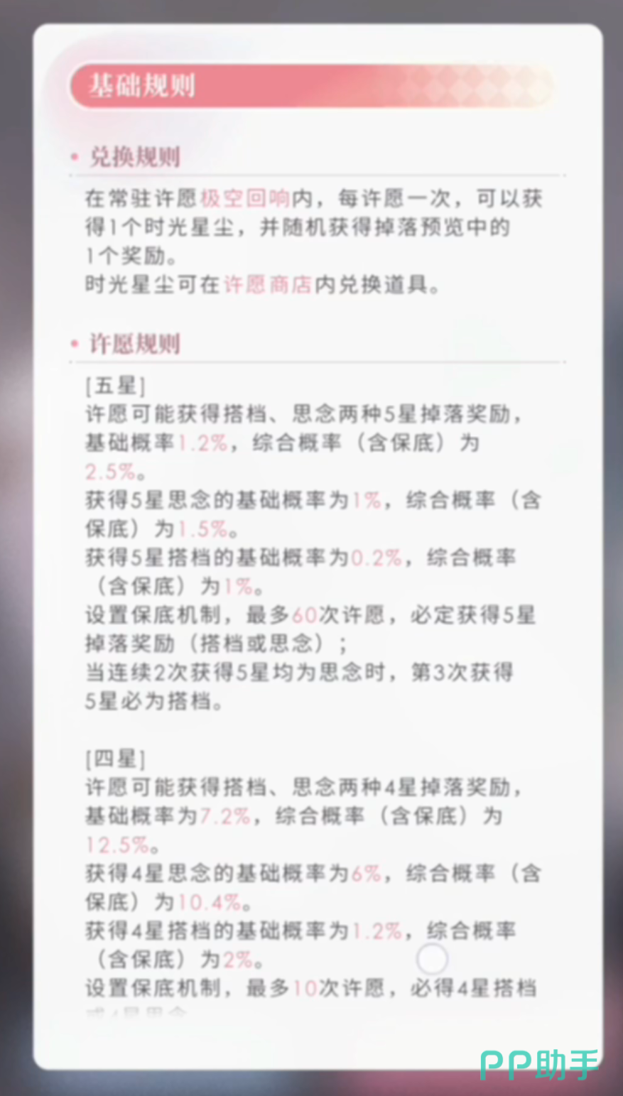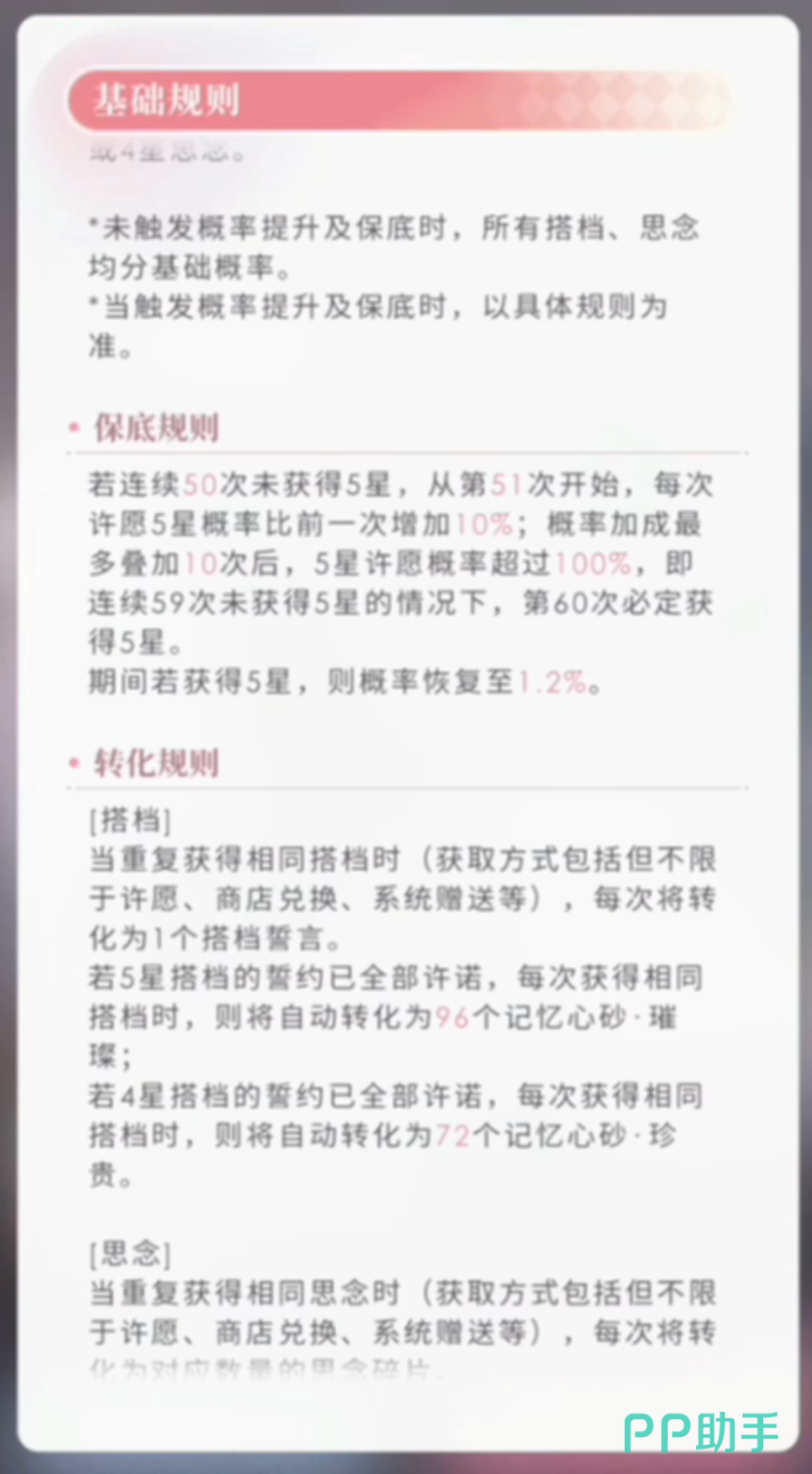 限定抽卡是指在特定的时间段内,玩家可以使用许愿券进行的抽卡,每次抽卡可以获得一张搭档卡或者一件装备。限定抽卡的搭档卡和装备的稀有度分为四种,分别是一星、二星、三星和四星,其中四星的搭档卡和装备是最稀有的,也是最强的。限定抽卡的概率如下:一星搭档卡:40%、二星搭档卡:35%、三星搭档卡:20%、四星搭档卡:5%、一星装备:40%、二星装备:35%、三星装备:20%、四星装备:5%。