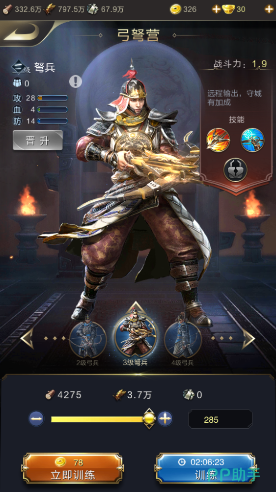 由于每个兵营都可以产生两种不同的兵,并且这些兵种都是交替出现新等级的,所以我们没晋升一次士兵,都是按照提升两级来进行的。比如三级的弩兵,下一级是晋升到五级的弩兵,因为四级的兵种是弓兵。