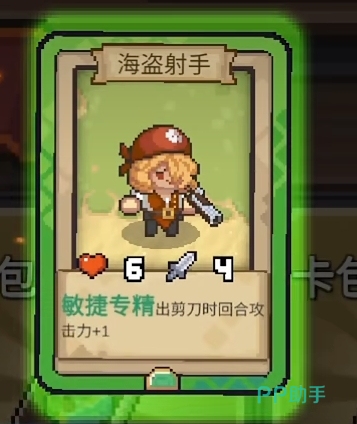 绿卡的话则比较推荐“海盗射手”,它的面板是6生命值+4攻击力,虽然这个面板看起来普普通通,但作为一张低品质的绿卡来说已经可以算是合格,而且它的技能“敏捷专精”也非常实用,能在出剪刀的时候增加自己一点攻击力,在对抗同为绿卡的对手时会展现出不错的压制力。