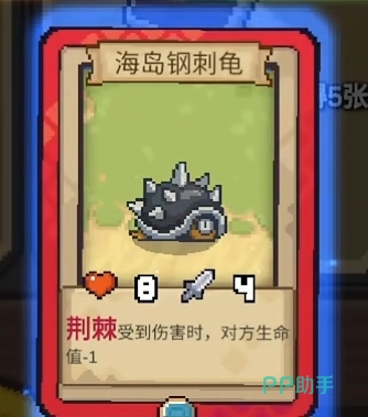 第二张比较推荐的是蓝卡“海岛钢刺龟”,这个卡的血量是非常接近boss卡的,有足足8点,打中端局的时候会发挥非常强的作用,4点的攻击力虽然低了一些,但它的技能“荆棘”却非常给力,可以在自己受到伤害时扣除敌人一点生命值,这对于运气不好的非酋玩家来说算是提供了一个保底,毕竟它意味着就算你一直猜拳失败也能磨对手一些血。