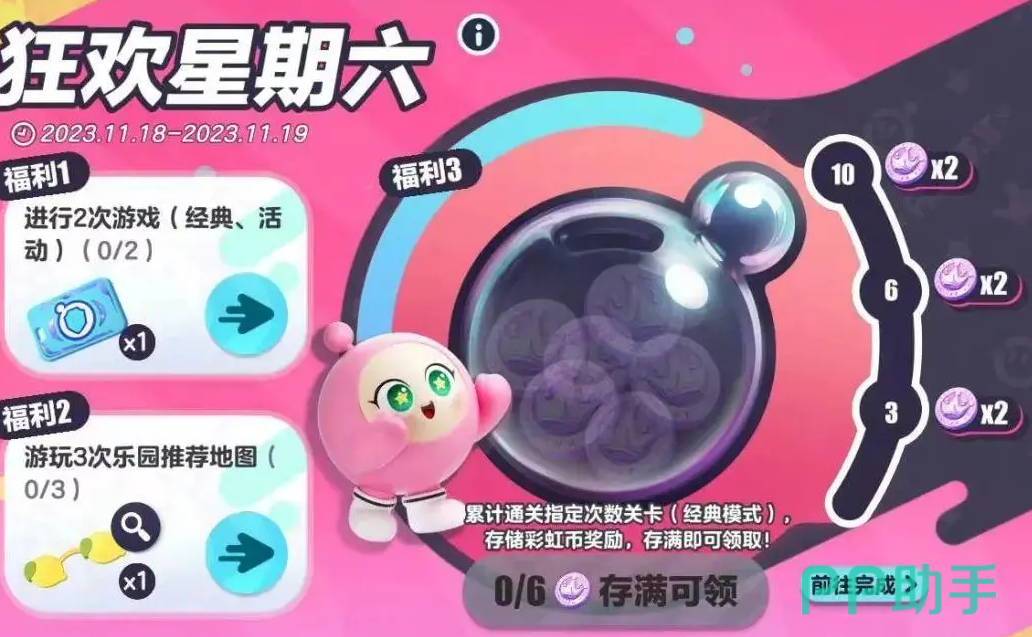 3,【狂欢星期六】同样是需要玩家们去完成一些指定的人物,然后就可以免费的获取【巅峰派对】的保护卡,同时还有超级西游搭配师可以获得,当玩家们在游戏中进行闯关的数量发达到了3,6,10次的时候,大家就会解锁2枚【彩虹币】,玩家们一共是可以获得6个彩虹币的,获得彩虹币后,大家需要把这些彩虹币放在【狂欢收集罐】中,彩虹币在这个地方存放满一周后,就可以进行提取了;不过每周的奖励都会进行一个重置哦,大家一定不要忘了在最后一天去进行提取哦!这个活动的任务通常是需要大家去参加一些比较经典的活动,同时打完两次游戏对局,而第二个福利活动就是需要大家去游玩一些刚更新的地图!小编会在下方给大家介绍!