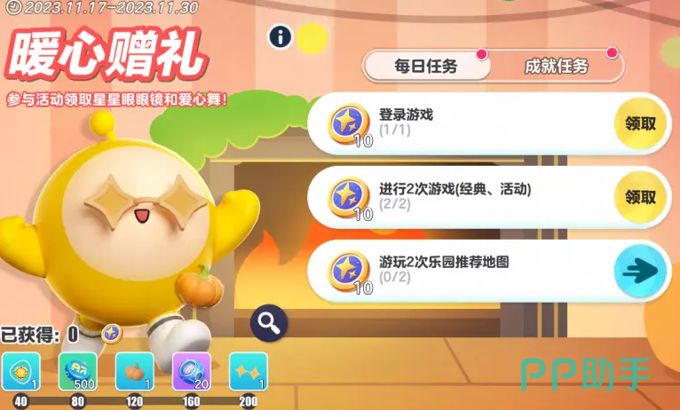 2,【暖心赠礼】本次活动结束的时间是在11月30号,活动时间还剩比较长的,打击在游戏中完成一些任务后,就可以获得大量的【星星币】,当玩家们获得的星星币达到一定数量的时候,就可以去兑换超级西游的配饰【甜南瓜】和【星星小眼睛】了,同时还给大家准备了免费的动作【爱心舞】可以领取哦;不过大家需要注意的是,本次的活动任务分成了每日任务,每日任务是固定三个的,通常都是一些对战活动,而成就任务则是跟本次感恩节更新的地图有关系哦!