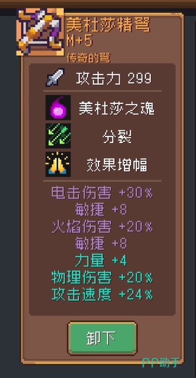 美杜莎精弩:它是一把远程武器类的装备,基础数值就提供了高达299的攻击力,并且三项特效也非常厉害,美杜莎之魂能够帮助你召唤蛇人助阵,分裂能让射出的子弹扩散攻击多名敌人,效果增幅则增强了技能的效果,三者结合可谓是大大提升了清图能力,再配上电火元素伤害,敏捷,力量以及物理伤害的加成,这使得角色能在实战中发挥十分亮眼的进攻表现。