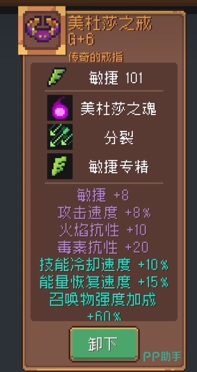 美杜莎之戒:这个戒指作为橙色的boss戒指提供了超多的属性加成,其中基础属性就有高达101的敏捷,技能方面除了这套装备都有的美杜莎之魂和分裂外,敏捷专精的出现也是进一步扩大了角色在爆发上限和输出频率上的优势。
