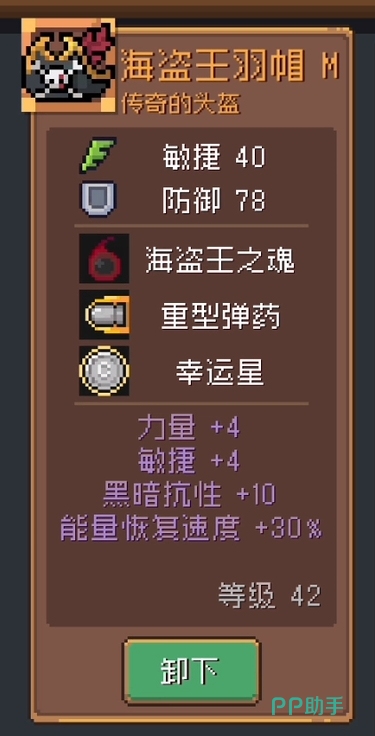 海盗王羽帽:它是橙色品质头盔,本身是出自boss海盗王的一个装备,基础属性同时提供了40的敏捷和78的防御,并且三个技能也是非常不错,海盗王之魂和重型弹药均可以明显的提升角色的爆发,而幸运星则能让你在刷怪刷材料的时候更加高效,此外其附加的四项属性包括力量,敏捷,黑暗抗性以及能量恢复速度在对抗后续黑暗属性的怪物和boss时都可以发挥很大作用。
