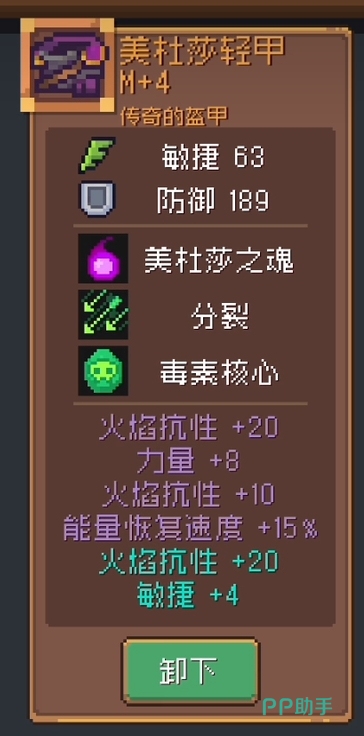 美杜莎轻甲:这又是一件美杜莎系列的boss装备,作为橙色盔甲,它在提供189防御的同时还给予了63的敏捷数值,另外武器有的美杜莎之魂和分裂它也有,在保障快速清怪的同时还给予了一个额外的“毒素核心”技能来强化持续伤害,这使得玩家在应对血量巨厚的boss时能够有效提升击败它的效率。