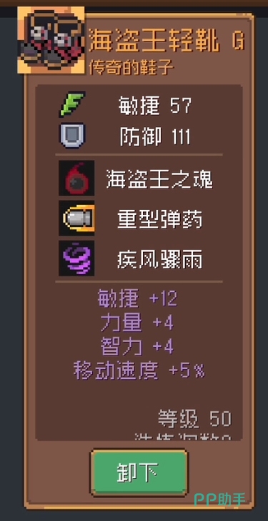 海盗王轻靴:这个靴子又是一件海盗王系列的boss装备,基础属性提供敏捷与防御两项加成,其中防御达到了破百的水准,配合其他防装,角色的承伤能力又上了一个台阶,技能方面仍然保有能提高爆发的海盗王之魂和重型弹药,另外疾风骤雨算是它的一个特有技能,可以明显提升角色的输出频率,附加属性这块,则提供敏捷,力量,智力和移速的四项加持,让玩家在输出和机动性两方面均得到了提升。