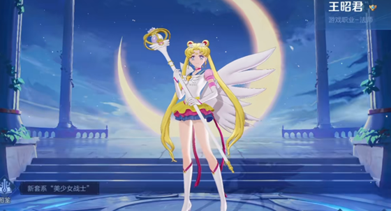 试问大家在游戏中听到【我要代表月亮惩罚你】的台词,谁不心动呢,本次的联动皮肤也是给到了游戏中最受欢迎的法师【王昭君】了,王昭君本次的形象是采用了比较经典的变身装扮,还原了水冰月的永恒形态,非常的甜美!