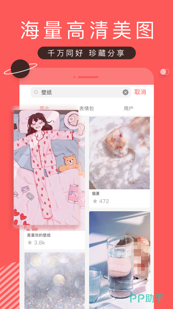 宠物图片、美食图片、风景图片、美女图片,这款软件全部都涵盖到了!只有大家想不到的主题图,没有大家找不到的美图!只需要轻轻点击搜索框然后输入,就能找到喜欢的高清大图了。