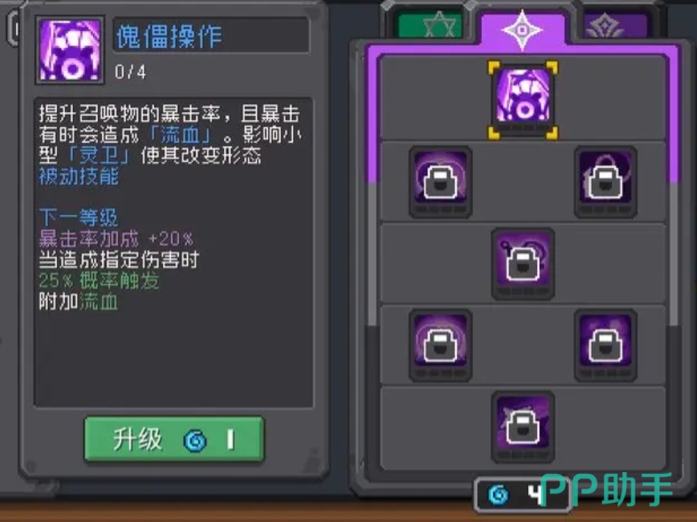第一个技能“傀儡操作”,这一技能可以提升召唤物的暴击率,并有机会通过暴击造成流血,该技能可以说和通灵师那套技能形成了完美联动,因为通灵师的技能主要就是召唤大小灵卫,在经过“傀儡操作”的加持之后它们的输出能力将变得更高,而且偶尔触发的流血对于本就拥有流血手段的盗贼页技能来说也算是锦上添花。