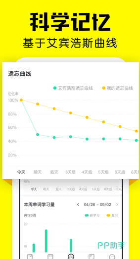 根据不同的阶段向我们推送恰当的训练项目,软件还会对一定周期学会的新词量进行整合、提供报表,让我们可以直观看到自己的进步。