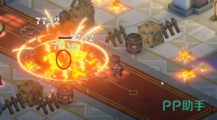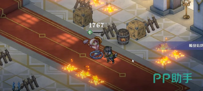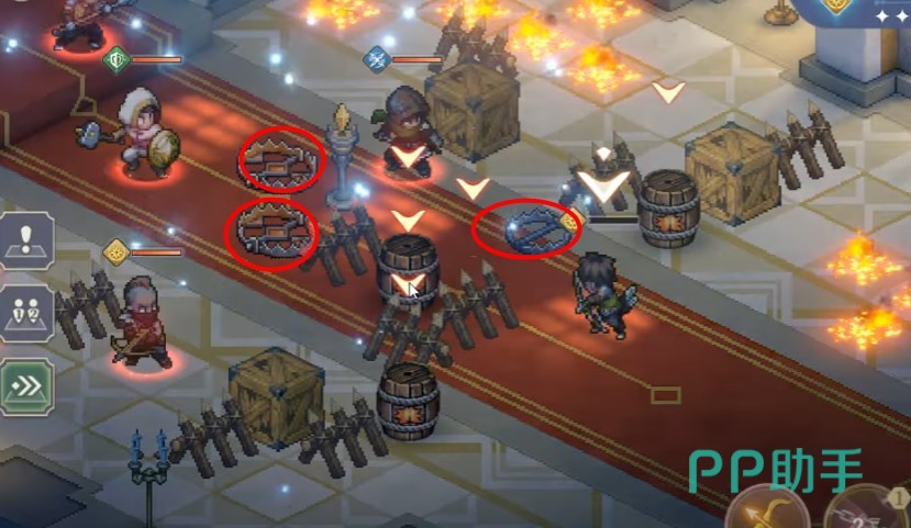 随后弓箭手引爆前面的炸药桶,敌方的盾兵会走到火墙陷阱上,枪兵则会被狱火爆炸陷阱命中,刺客向前触发强力捕兽夹,至此这三个敌人都残血了。另一个弩手会移动到左边炸药桶附近。