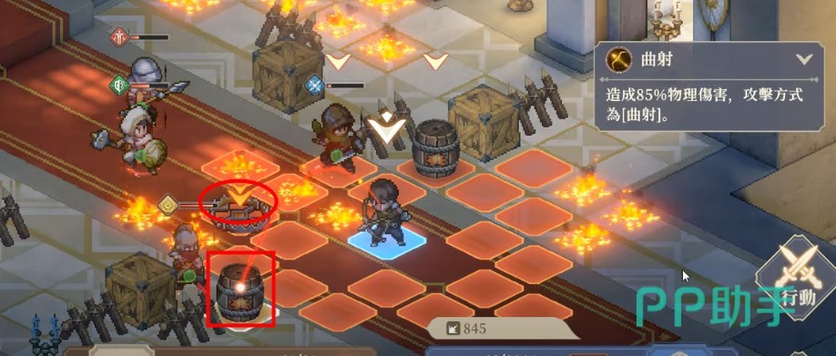 第2个回合,在左上角如图所示的位置放一个火墙陷阱,同时引爆左边的炸药桶,收掉左边的弩兵。盾兵前进触发火墙陷阱带走左边的刺客,盾兵和枪兵的也都残血了。