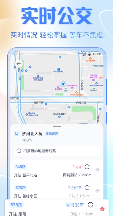 只需输入你的目的地,就会为你推荐多条能够到达目的地的公交线路。你可以自由选择等车时间最短的路线、到达时间最短的公交线路,还有费用最少的路线,这样你就可以轻松找到最适合自己的公交方式了。当你到达公交站后,还会为你提供站台附近的信息,让你更加了解周围的环境。无论你走到哪里,都会为你提供实时的公交信息!