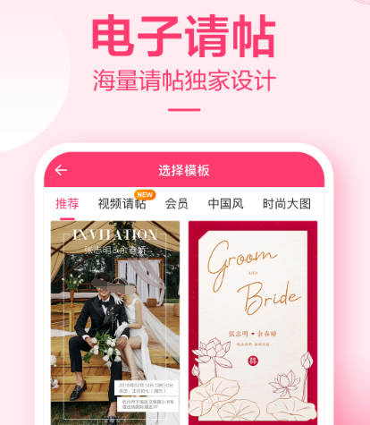 对于新人结婚来说,制作的请帖当然是以简洁大方为主了,该软件里就是专门为了结婚的人设置请帖而设置的,里边有海量的请帖内容,还有一些是独家设计出来的。在制作的时候具有丰富的动效以及多种效果,还具有DIY编辑功能以及自定义功能,宾客也可以在看到请帖以后发送祝福。