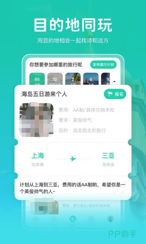 如果友友们在旅游途中感到孤单,可以通过此款软件相约伴友,输入目的地后会显示出想要一起游玩的用户,大众们可以自行匹配好友,在旅行途中一起找到诗和远方的故事,在软件中可以和伴友一起制定出行计划,住形和吃喝玩乐,大众们也可在动态中发布属于自己独特的旅游精彩瞬间。
