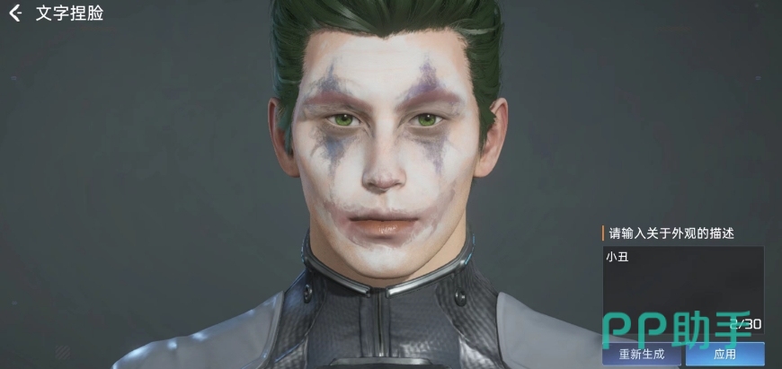另外除了这一关键词外,还有一些其他比较有趣的关键词这里也分享给大家,第一个就是“小丑”,这个描述虽然非常简单,但是得到的脸却是非常符合与其,绿色的头发,还有小丑妆容独有的白色粉底,以及黑色眼影和烈焰红唇,看上去非常的具有小丑味道,而且它这个形象还有几分美漫小丑中的影子。