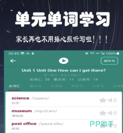 软件将课本的内容全部都同步到了手机荧屏上边,从小学到初中所有的教材应有尽有,自带的点读功能让你可以清楚的了解每一个发音,从而提升你的听力能力。