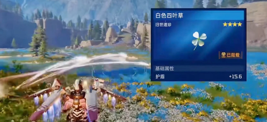 白色四叶草就是游戏中一个四星的旧世遗珍,使用的时候是可以带来护盾加成效果的,如果在上面增加了远程效果的话,就可以增加一定的伤害数值,特殊效果上面是针对大家采集次数的,只要玩家的采集次数超过100就可以增加一定的攻击数值,这个效果最高的时候可以叠加4层。