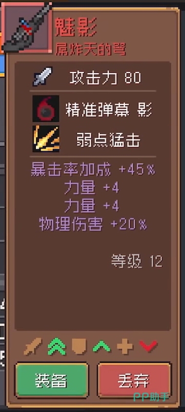 魅影:这是把远程武器,初始攻击力就高达80,而且还附加了许多增加伤害的词条,比如能够增加攻击的力量,又比如能直接增加输出上限的暴击率与物理伤害加成,另外它的两个技能也非常给力,精准弹幕影可以发射额外的弹幕对敌人造成属性伤害,弱点猛击则可以让你更快的进行单点秒杀。