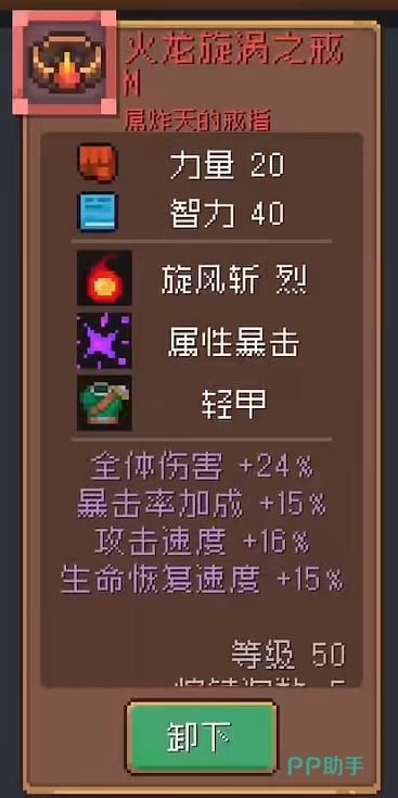 火龙旋涡之戒:这个戒指应该是最契合战士以及战士融合职业的饰品了,首先它在基础属性中有战士所需要的力量,羁绊方面,其独有的“旋风斩·烈”更是可以直接将战士技能中的“旋风斩”给转变为火焰属性的伤害,对于多数敌人来说,这类型的伤害将会显得更加具有威胁。