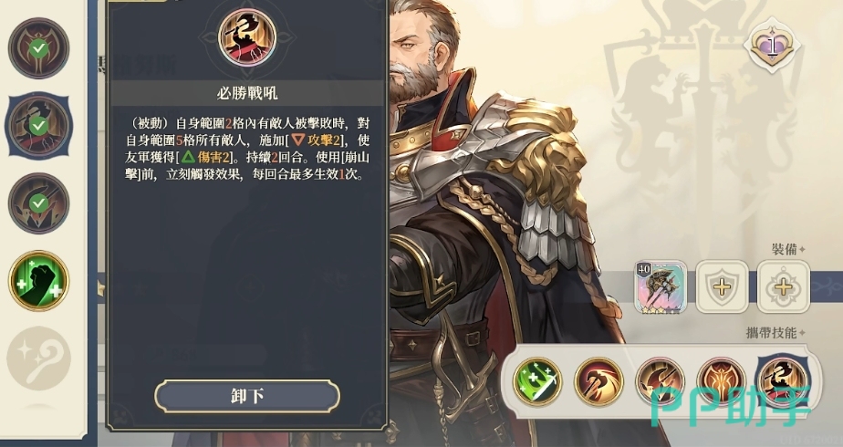 在升阶之后就可以带来一个瞬发的效果,并且将自身物理防御值40%的数值直接加在攻击效果上面,当然如果在使用这个技能的时候他受到伤害的话那么提高的百分比也会也达到8%的提升效果,接下来的两个回合都会有效,在三阶的时候就可以对他周围的三到四个格子上面的敌方带来一个输出效果,在造成了70%输出效果的时候,还可以影响到这些敌人的移动速度。