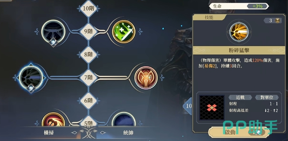 在十一阶的时候可以增强自己的输出效果达到10%,如果触发了反击效果的话那么这个时候伤害提升的数值能够达到30%,统帅这个技能在一阶的时候可以带来的区域跟上面的十一阶范围其实是差不多的,也是3*2的区域范围,甚至也是一样的输出伤害,在三阶的时候可以影响到周围两个格子之内的敌人,只要是这个敌人被击败的话,那么在上面还可以将自己的队友伤害再次提升两点,而且可以呈现两个回合的提升效果。