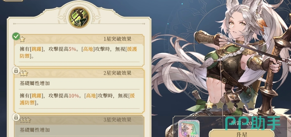 在九阶的时候可以带来一个单体攻击,但是这个时候造成的物理伤害可以直接达到120%这么高的数值,十一阶的时候是非常强的,直接无视目标的阻挡效果,这个时她的攻击数值也会提升12%,敌人在受到这个攻击之后,直接无法被其他的队友援护了,所以她使用这个效果的话,可以达到一个收割的效果。