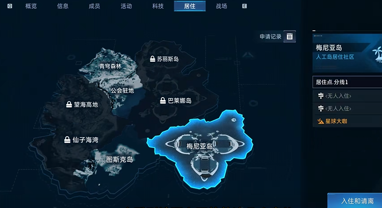 所以需要和一个好友的好感度达到400分的时候,才可以共同开辟人工岛,玩家们需要先加入一个公会当中去,然后在上方的【居住】按钮汇总,选择一个自己要入驻的岛屿,点击后就可以搬入人工岛了!