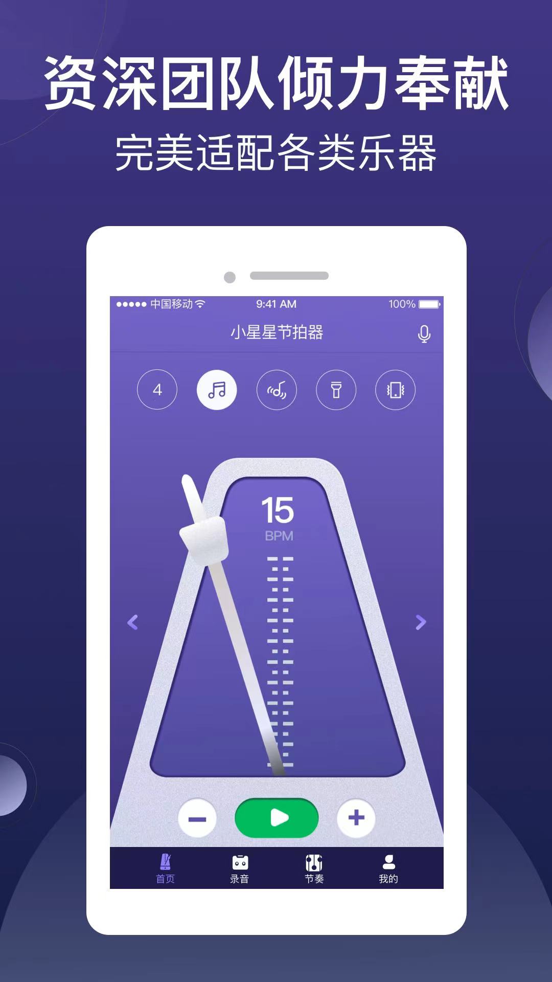 这个软件是许多专家都推荐的节拍器软件,有非常精准的节奏提示,还可以自定义设置节奏间隔时间,智能提醒用户的节奏节拍,有超多不听音乐的音乐节拍符,不同的音乐都不一样的节奏节拍,不仅涵盖不同的音乐节拍另外还有一些其他的乐器。古筝谱曲等应有尽有。可以在节拍里调节变速灵敏度和速度增量等等。多种增感音质效果随意切换。有超多完美的音效等你来体验。