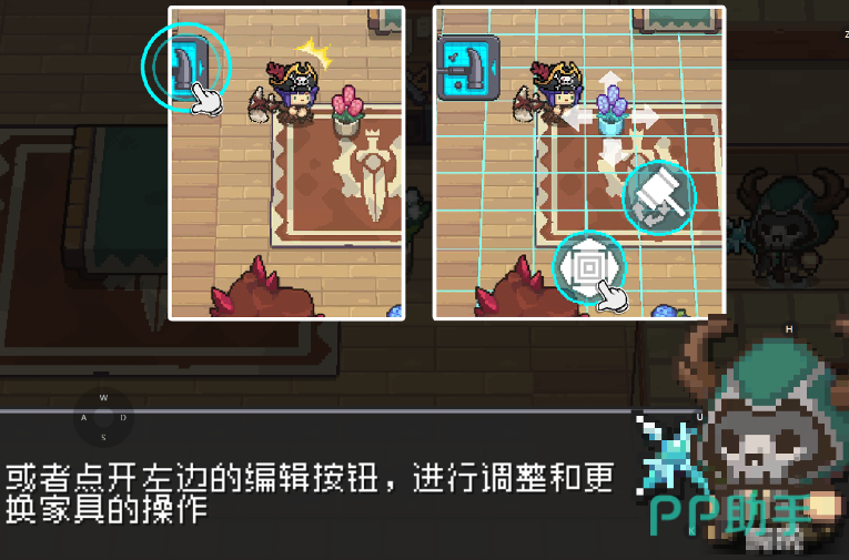如果大家想更换家具的位置,那么就需要先点击左边的【锤子】图标,点击后,选中一个家具,在右下角有一个转盘一样的标志,点击后就可以更换位置和方向了!在游戏中玩家们还可以扩建这个地下室的面积!