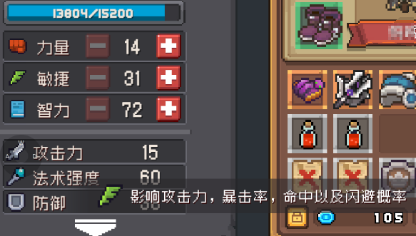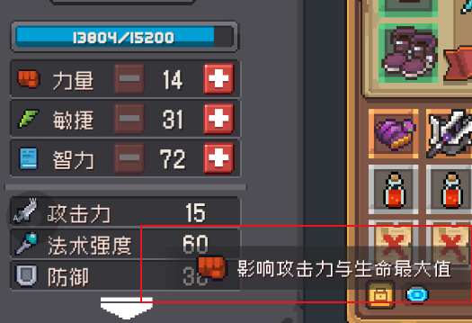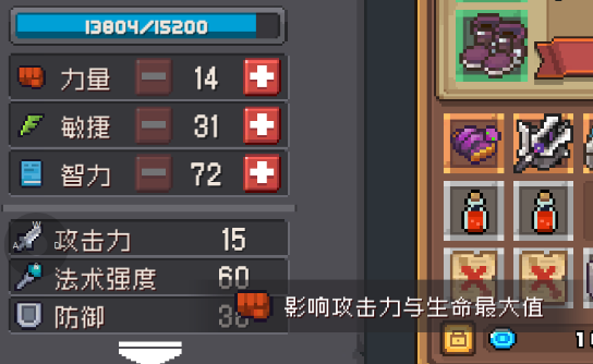 最后一个就是【力量】,大家可能会觉得是增加防护效果的,其实不是,这个属性的加点是可以获得大量少生命值的加成的,同时还附加攻击力,就比较适合游戏中的战士或者守卫等职业!