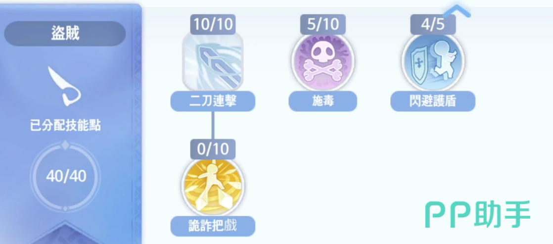 如果玩家们药水储备不是很够的话,是可以先不着急去点施毒,而是先点残影。残影本身可以永久提高闪避值和移速。满级的残影可以提供30点的闪避值,同时还增加玩家5%的移动速度。这个闪避值在对付一些命中不是很高的敌人是有着很不错的效果。在点满之后盗贼可以前往海底进行练级。之后点满藏匿和闪避护盾。闪避护短也可以只点到4级。这两者都是用来潜行和提高生存来使用的。最后点上后退回避盗贼技能加点就完成了。
