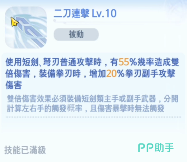 之后说技能的点法,玩家们首先第一个要点的技能是二刀连击,这个技能是盗贼的招牌技能,本身是被动技能并没有什么消耗。技能点满之后会有着55%的概率可以触发连击,并且玩家如果装备的是拳刃的话,还会增加20%的副手伤害。这个拳刃武器也包括短剑武器,玩家前期没有拳刃的话直接装备短剑也是没问题的。
