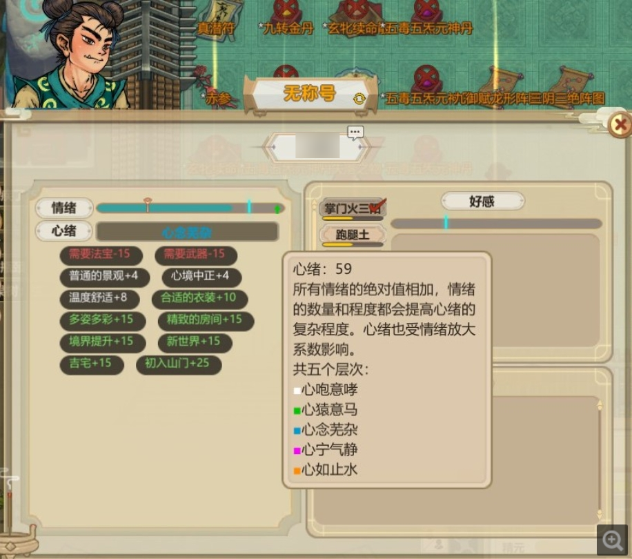 上述就是了不起的修仙模拟器心绪怎么降低的方法分享。角色属性中的心绪稳定对于角色的心境的修炼是非常有帮助的,小编有提供了短暂的降低方法也有长期的保持稳定的方法,玩家们可以自行选择方式来达到稳定心绪的目的。