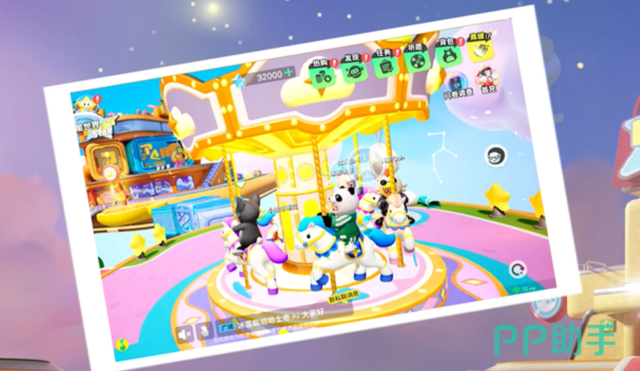 童话木马位于乐园广场的小游乐场,是一个有着粉色和蓝色主题的圆形平台,上面有各种可爱的动物造型的木马,比如小马、小熊、小鹿等。你可以选择你喜欢的木马,然后点击“进行交互”,就可以坐上去了。木马会随着音乐旋转起来,你可以感受到风的轻抚和木马的摇摆,就像进入了一个童话故事一样。