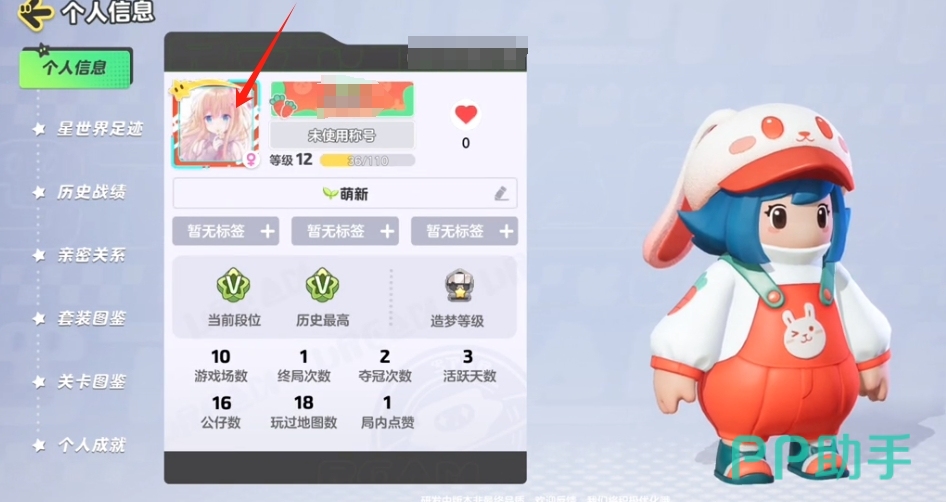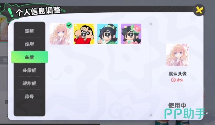首先你需要打开个人信息界面,然后点击左上角自己目前的头像图片,之后你就会来到下图这个“个人信息调整”的页面,该页面中有一个默认头像和三个游戏自带的卡通头像,其中默认头像就是你的qq头像,想要更换的话直接去自己qq换即可。