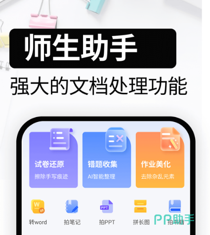 这不仅是一个能对试卷进行扫描的,还提供错题整理重组试卷的功能,一键扫描试卷就能清除手写的笔记,还原空白试卷,特别的容易。在去除笔记的时候,还可利用里边的功能以及橡皮等等方式来做到。还包括自由框选错题以及智能,只整理错题的功能。在不会任何题目的时候都可拍照快速搜题,轻松找到答案。