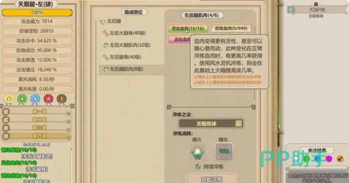 生机精华是每一次都能得到1-3个的样子,生命本源吃了三四个药才得一个,最后一个的爆率就更小了。能够得到精华的数量是和格物的等级有关系的,所以在升内门之前,需要将巧匠的等级给练上去。可以在一开始的时候让体修吃人生,蛇胆,芝草等灵药来将生机精华给刷出来,接下来就使用无极炼体,以及精华的配合来将前大腿的肌肉进行淬炼,词条的话优先选择“元祖化”,以及“血肉增生”。