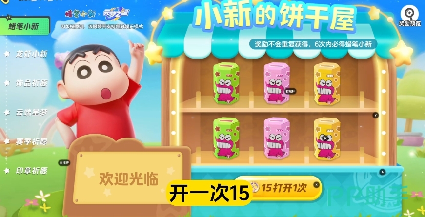 目前联动的小新皮肤只有两款开放了获取途径,第一个是经典款的红T恤黄短裤小新,这个小新需要通过饼干屋活动来抽盲盒获得,抽一次需要花费15元,而因为盲盒总共只有六个,所以保底90就能获得它。