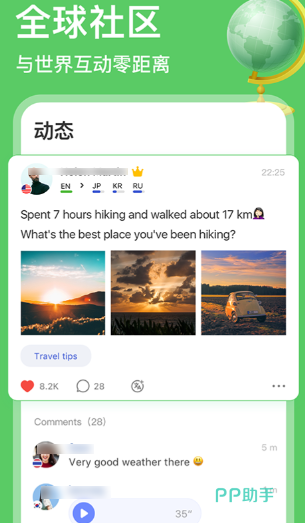 非常给力的全球社区交流平台,在这里我们可以标注上自己掌握的以及正在学习的语种,系统也会结合兴趣tag来为我们匹配一些不同的聊天对象。在这里还可以自由发表一些动态或者是对学习生活的感悟。