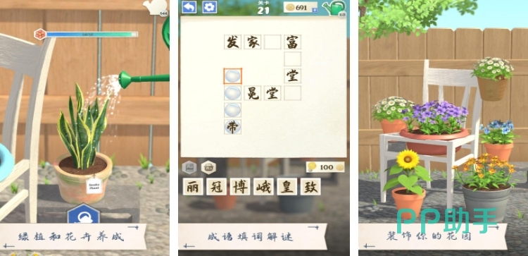 在这里,你可以打造属于自己的小天地,种植各色美丽的花草,与乡村动物们互动。不止是玩乐,更是收获。你将学习和运用各种成语,提升你的文化素养和语言能力。想象一下,每个关卡都等待着你来填补缺失的成语。你需要根据提示和上下文,准确地插入合适的成语。每成功填写一个,你就能获得丰厚的奖励,譬如金币、道具或水滴。而水滴是游戏中非常重要的资源,你可以用它来灌溉你的花园,让花草茁壮成长,绽放出美丽的色彩。
