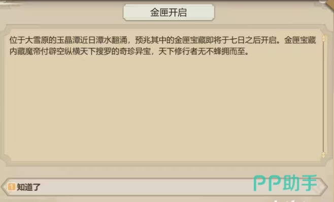在游戏中大家其实想要开金匣子的话是需要去解锁玉晶潭秘闻的,而且有三次机会可以开启,项想要开启就必须去大雪原,触发的地点就在大雪原上面,可以派弟子去这个地点进行历练,在将大雪原的所有地点都解锁之后,就会出现一个隐蔽的地点,这个地点就是玉晶谭,在上面是可以提前解锁的哦,在解锁之后大家派出弟子就会获取秘闻,这个秘闻开启之后是有六个选择的,在选择的时候大家就会看到后面括号中的要求。
