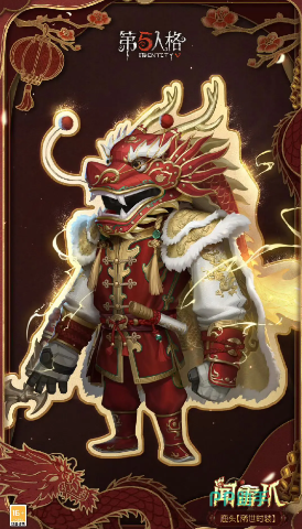 2,监管者鹿头的春节限定【闻雷爪】以及随身物品【竹龙玉】,这款皮肤的特效非常的出彩,鹿头携带的面具更换成了龙头套,而且全身周围还有金色的雷电环绕,这个是随身物品带来的特效!