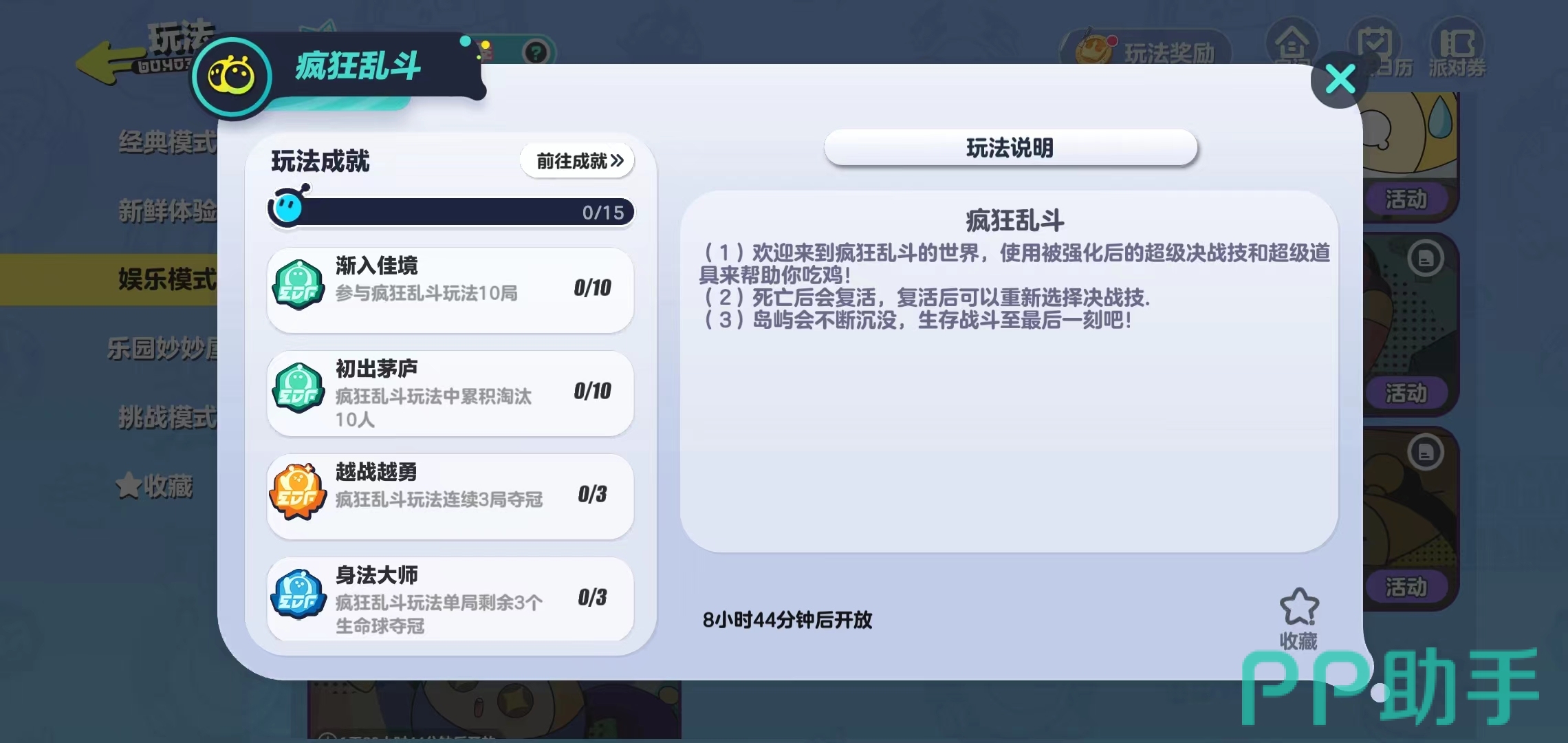 大家先和小编一起看看疯狂乱斗的基本玩法。每局游戏有9个岛屿组成,每个岛屿都有不同的特色和障碍,比如弹床、冰块、风车等。需要在空中选择一个降落点,然后在岛屿上寻找道具和爱心。道具可以增加玩家的攻击力和移动速度,爱心可以增加玩家的生命值。每局游戏有三次复活机会,复活后可以再次选择降落点和决战技。决战技是玩家的超级技能,可以在关键时刻发挥巨大的作用,像什么无敌、巨大化、雷电等。随着时间的推移,场地会逐渐沉没,玩家需要不断跳跃到安全的岛屿上,直到只剩下一个玩家,就是胜利者。