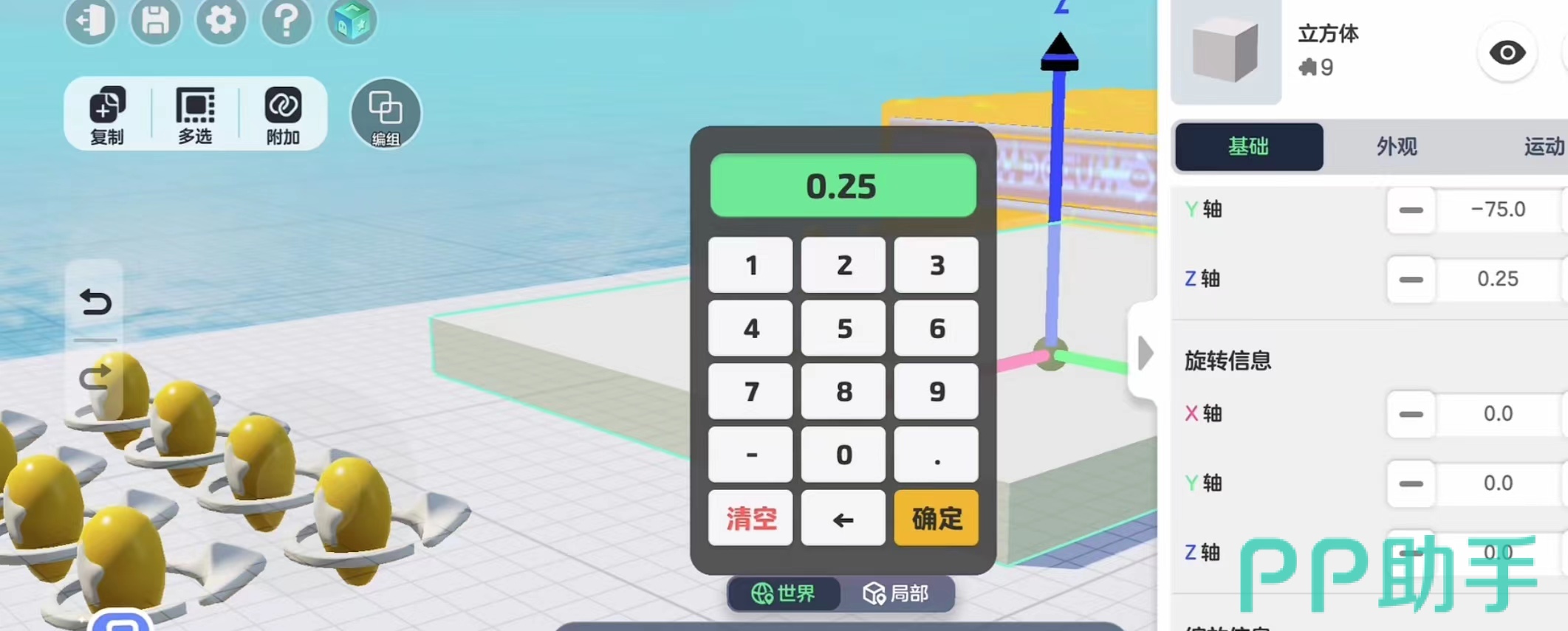 那么要怎么改变物体颜色呢?这就需要用到界面下面的工具栏了,在这里有移动缩放镜像以及删除和编辑这五个功能,前面四个都是十分简单的,玩家只需要按照自己的想法改变物体的位置和大小就可以了。想要改变物体的颜色就需要用到编辑,打开编辑界面我们会看到有基础,外观以及运动三个栏目,我们选择外观这一栏就可以改变物体的外观以及颜色了。基础界面玩家可以根据自己的想法去调整物体的数值,而且还可以多个相同物体一起调整,十分的实用方便。