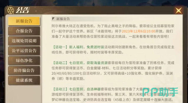 最近一次开新区的时间是在2023年的12月6号,冰霜领地就是最新的一个新区,在这个新区里面,一共推行了三个主要的活动,第一个是新人福利,如果玩家还没有体验过这个游戏的话,那可以在这个活动期间去注册并完成相关的任务,就可以获得专属称号,还可以领取限时服装。