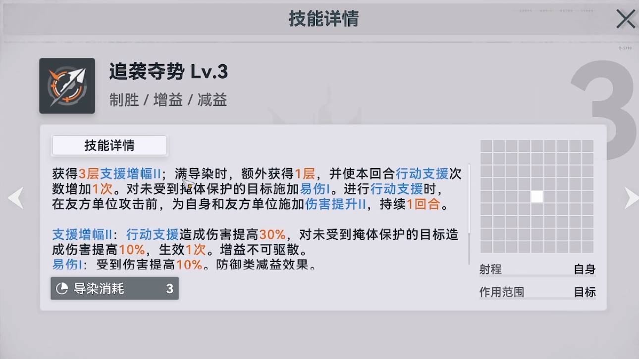 琼玖的爆发能力非常高,其技能均为单体,并且能为自身的输出附带一定的增益效果。其中,琼玖的大招追袭夺势在释放能为她提供三层的支援增幅,满导染的情况下还能再获得一层,并且还具备着给未被掩体保护的敌方施加易伤buff,为所有友军带来伤害提升的增益。同时,在琼玖释放大招后,只要友军攻击的目标在琼玖的攻击范围内,那么在敌方受击后琼玖还会再向该敌人进行一次攻击。